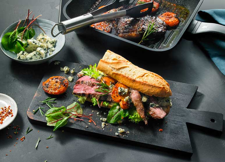 - Mięso pokroić i położyć na pieczywo. Na wierzchu położyć kawałki moreli i pokruszony ser. Zamknąć górną połówką bagietki.