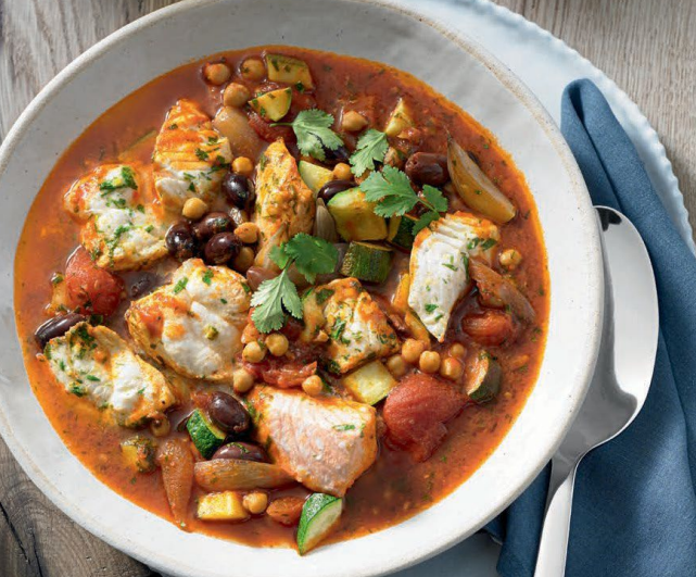 4. Dodaj oliwki do sosu, wymieszaj i dopraw odrobiną soli, pieprzu i 1 łyżką stołową mieszanki przypraw ras el hanout. Wyjmij połowę sosu, włóż kawałki ryb i marynatę do wysokiego garnka Fusiontec Aromatic 24 cm układając je blisko siebie i zalej wyjętym sosem. Duś tadżin pod przykryciem na średnim ogniu przez około 30 minut.