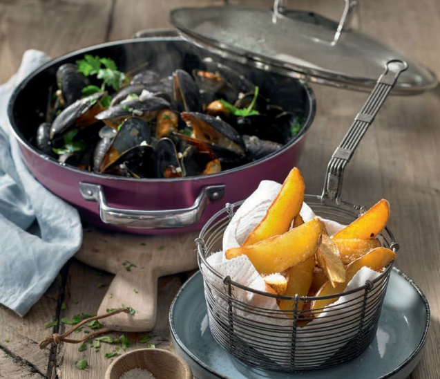 4. Aby przygotować frytki, rozgrzej olej w wysokim garnku Fusiontec Mineral 24 cm do 120°C, wkładaj ziemniaki partiami i wstępnie smaż przez około 8 minut. Wyjmij frytki zanim się zarumienią i odsącz na papierowym ręczniku.