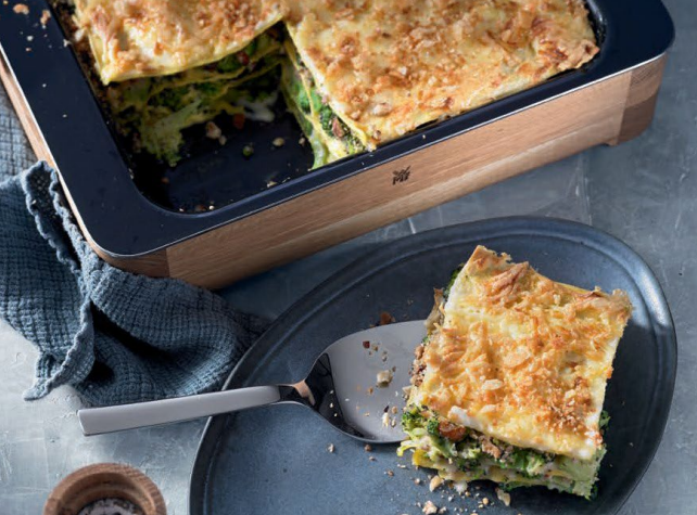 5. Pokryj dno blachy do pieczenia M Fusiontec cienką warstwą beszamelu i ułóż na nim płaty lasagne jeden obok drugiego. Dodaj warstwę 1/3 brokułów i 1/4 orzechów, polej beszamelem i przykryj kolejną warstwą płatów lasagne. Lekko dociśnij, polej beszamelem, dodaj warstwę 1/3 brokułów i 1/4 orzechów i przykryj kolejną warstwą płatów lasagne. Polej beszamelem, dodaj resztę brokułów i 1/4 orzechów, polej beszamelem, przykryj ostatnią warstwą płatów lasagne i dociśnij. Polej pozostałym beszamelem. Wymieszaj ser alpejski, bułkę tartą i pozostałe orzechy, posyp lasagne i piecz w nagrzanym piekarniku na drugim poziomie od góry przez około 30 minut, do uzyskania złoto-brązowej panierki.