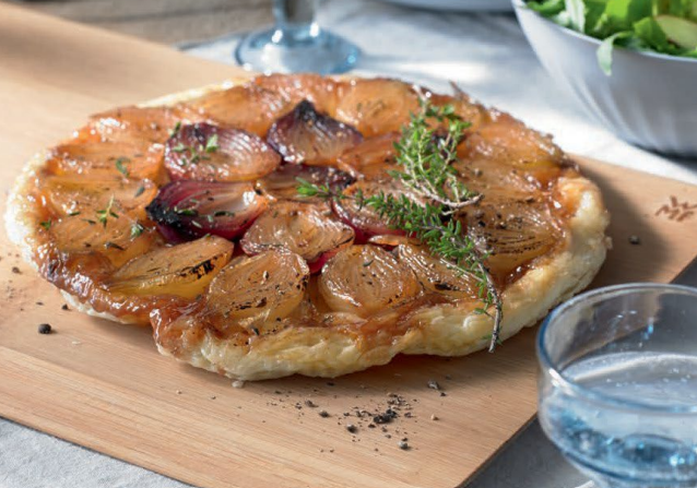 5. Rozpuść masło na patelni do duszenia Fusiontec 28 cm. Pokryj dno patelni równomiernie resztą cukru i tymiankiem. Włóż cebule przeciętą stroną do dołu, układając je ściśle obok siebie. Rozwałkuj ciasto francuskie i połóż na cebulach. Dociśnij ciasto przy krawędzi patelni.