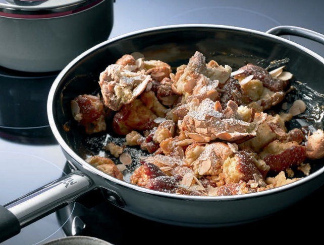 4. Rozpuść 1 łyżkę masła na patelni Fusiontec 28 cm, wlej ciasto i krótko podsmaż. Posyp migdałami w płatkach i cukrem pudrem i pozostaw Kaiserschmarren na około 10 minut do ścięcia, aż powstanie zwarty naleśnik. Podziel Kaiserschmarren na kawałki wielkości kęsa przy pomocy dwóch widelców.
