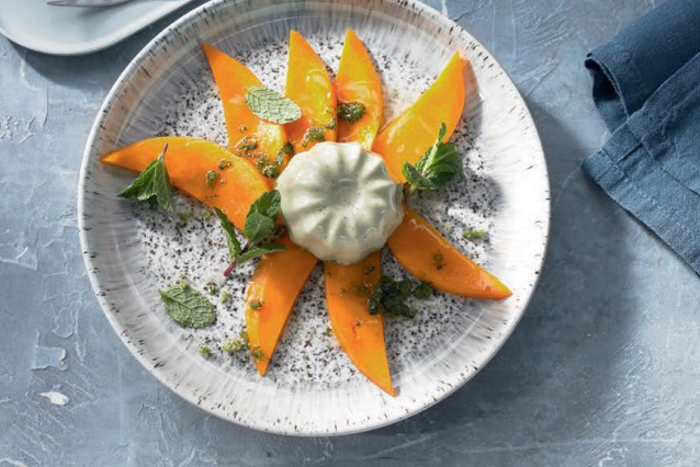 4. Obierz mango na krótko przed podaniem, oddziel miąższ od pestki i pokrój w cienkie plasterki. Podawaj rozłożone na talerzyku deserowym i skropione odrobiną soku z cytryny.