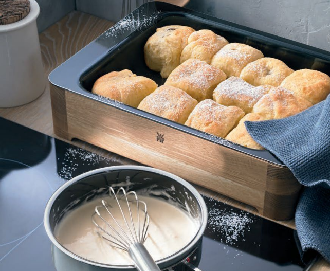 2. Rozgrzej piekarnik do 180 °C na funkcji góra/dół. Posmaruj blachę do pieczenia L Fusiontec odrobiną masła. Wymieszaj mus śliwkowy z anyżem. Zagnieć ciasto na blacie lekko podsypanym mąką. Odrywaj małe kawałki ciasta i formuj kulki o średnicy 3 cm. Rozpłaszcz kulki, nałóż na każdą 1 łyżeczkę musu śliwkowego, zaklej ciasto i ponownie uformuj kulki. Ułóż kulki z ciasta obok siebie w blasze do pieczenia, tak aby lekko się stykały. Posmaruj przestrzenie pomiędzy kulkami i krawędzie brytfanny pozostałym masłem. Przykryj i odstaw do wyrośnięcia na kolejne 30 minut.