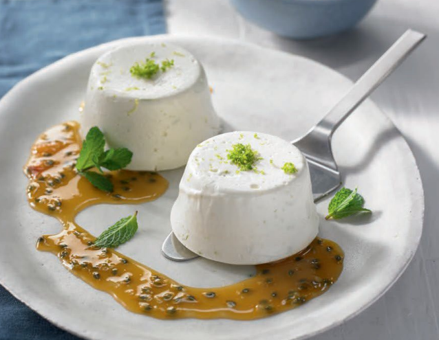 6. Wyjmij mus jogurtowy z miseczek i podawaj z sosem. Udekoruj miętą i startą skórką z limonki.