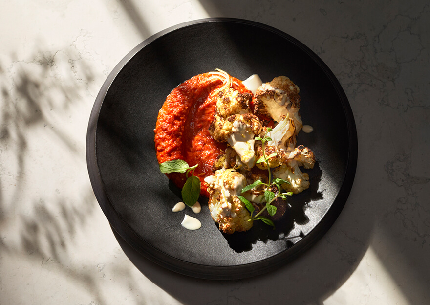 W międzyczasie umieść grillowaną paprykę w robocie kuchennym wraz z wędzonymi migdałami, octem jabłkowym, ząbkiem czosnku i odrobiną oliwy z oliwek. Miksuj, aż powstanie gładki sos. Dopraw solą i pieprzem do smaku. Na talerzu rozprowadź sos romesco, na wierzchu ułóż pieczonego kalafiora i skrop sosem cytrynowo-tahini. Udekoruj miętą, dopraw solą, pieprzem i sokiem z cytryny.