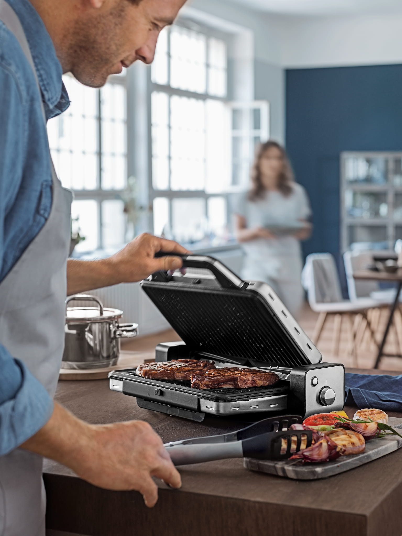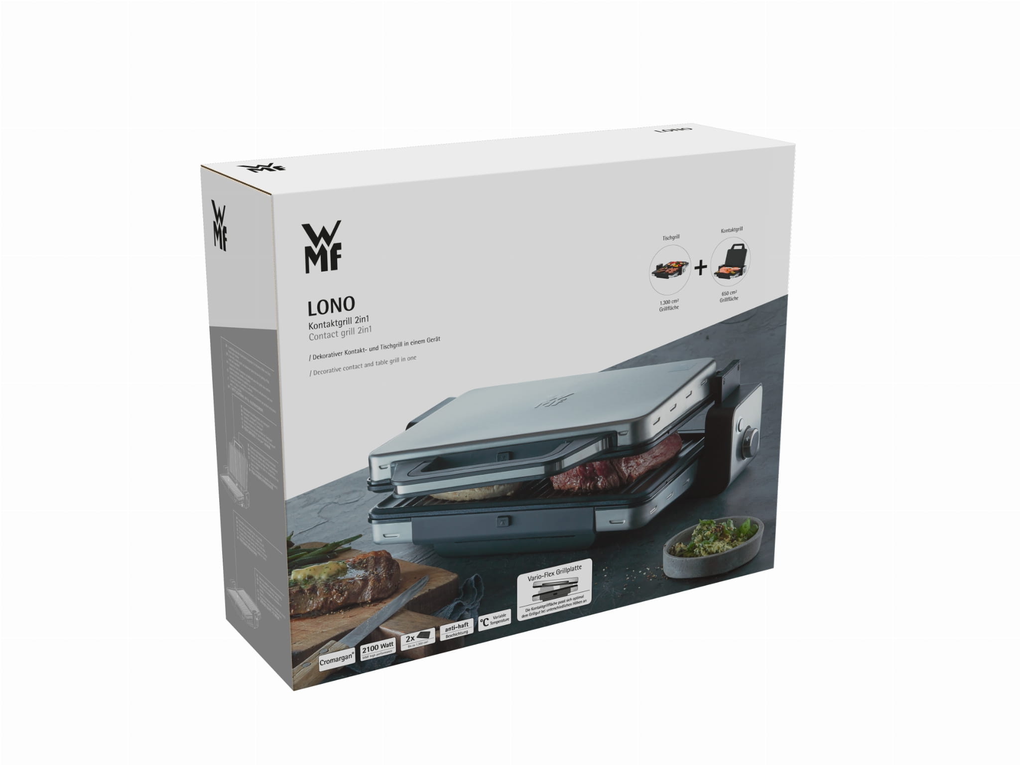 Grill elektryczny WMF z kolekcji Lono będzie niezastąpionym urządzeniem który umożliwi Tobie cieszyć się grillem zarówno na zewnątrz lub w swoim mieszkaniu! Specjalna konstrukcja urządzenia umożliwia również przygotowanie przepysznych tostów, tortilli lub odgrzać bułki z ubiegłego dnia – grill i opiekacz/toster w jednym. Wielofunkcyjność, która nie powinna zabraknąć w żadnej kuchni.